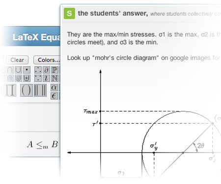 • Piazza is very nice, my students are enjoying it. I particularly like being able to use LaTex commands to display the mathematical formulas. We hold on-line review sessions before every test, and it's much neater than the whiteboard options.